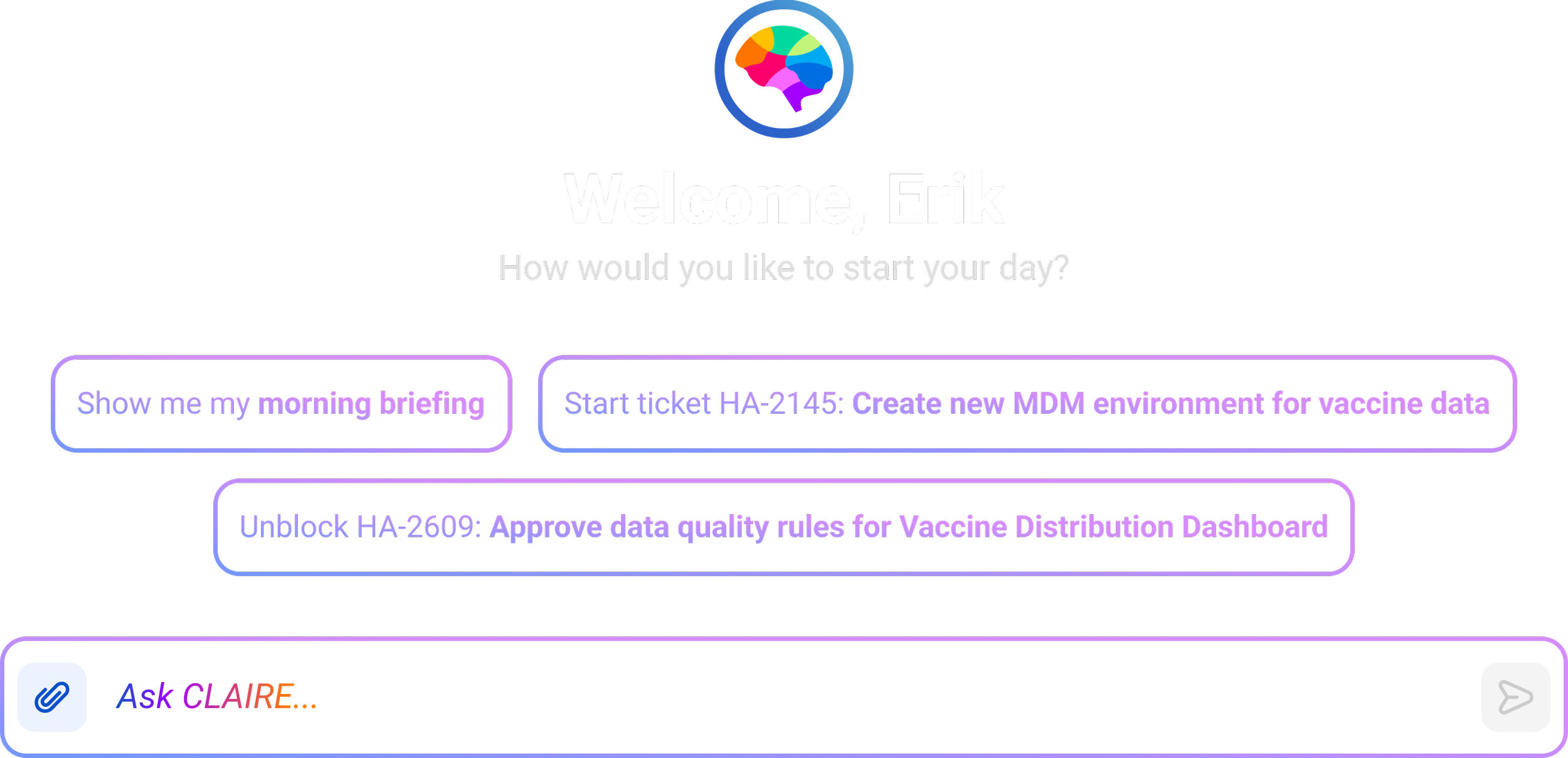 I reimagined CLAIRE as an active teammate for developers and data engineers. Through Jira integration, the new homepage presents smart prompts for high-impact data tasks—automatically prioritized by due date, relevance, and complexity. When users engage, CLAIRE analyzes the Jira ticket and supporting documents to generate tailored suggestions. With just a few clicks, users can watch CLAIRE handle complex tasks like entity creation, schema refinement, and automated data quality rules.